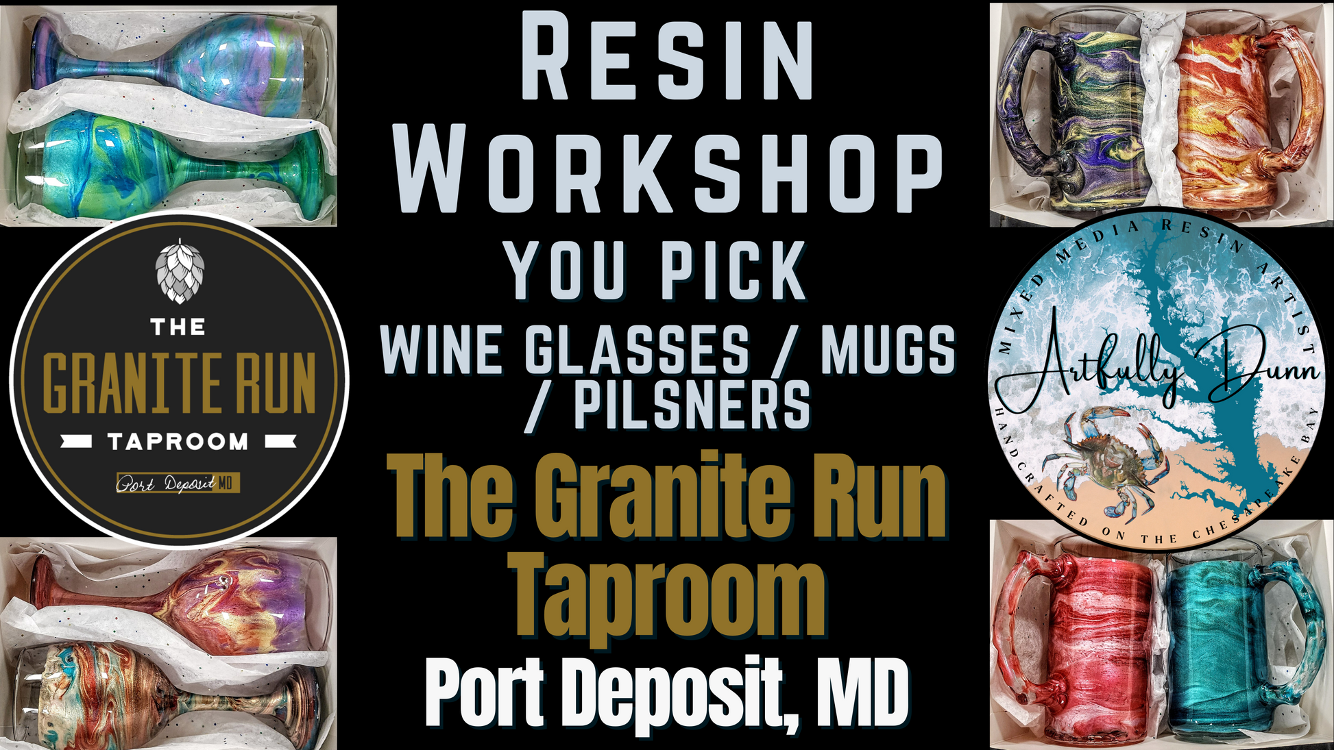 10/19/24 - 12:00-2:00 PM ● Workshop - Resin Mica Swirl - Wine Glasses, Handled Mugs, Pilsners ● The Granite Run Taproom - Port Deposit, MD
